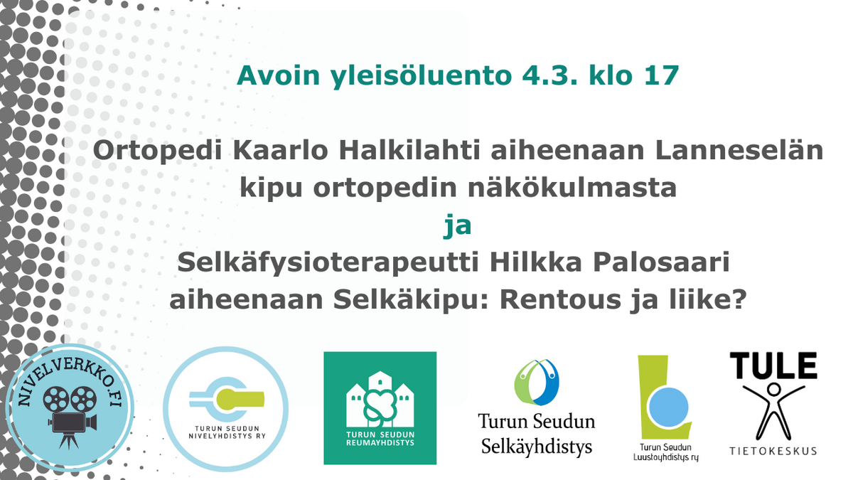 Luennon järjestävät yhteistyössä Turun Seudun Nivelyhdistys, Turun Seudun Luustoyhdistys, Turun Seudun Selkäyhdistys, Turun seudun Reumayhdistys sekä TULE-tietokeskus.